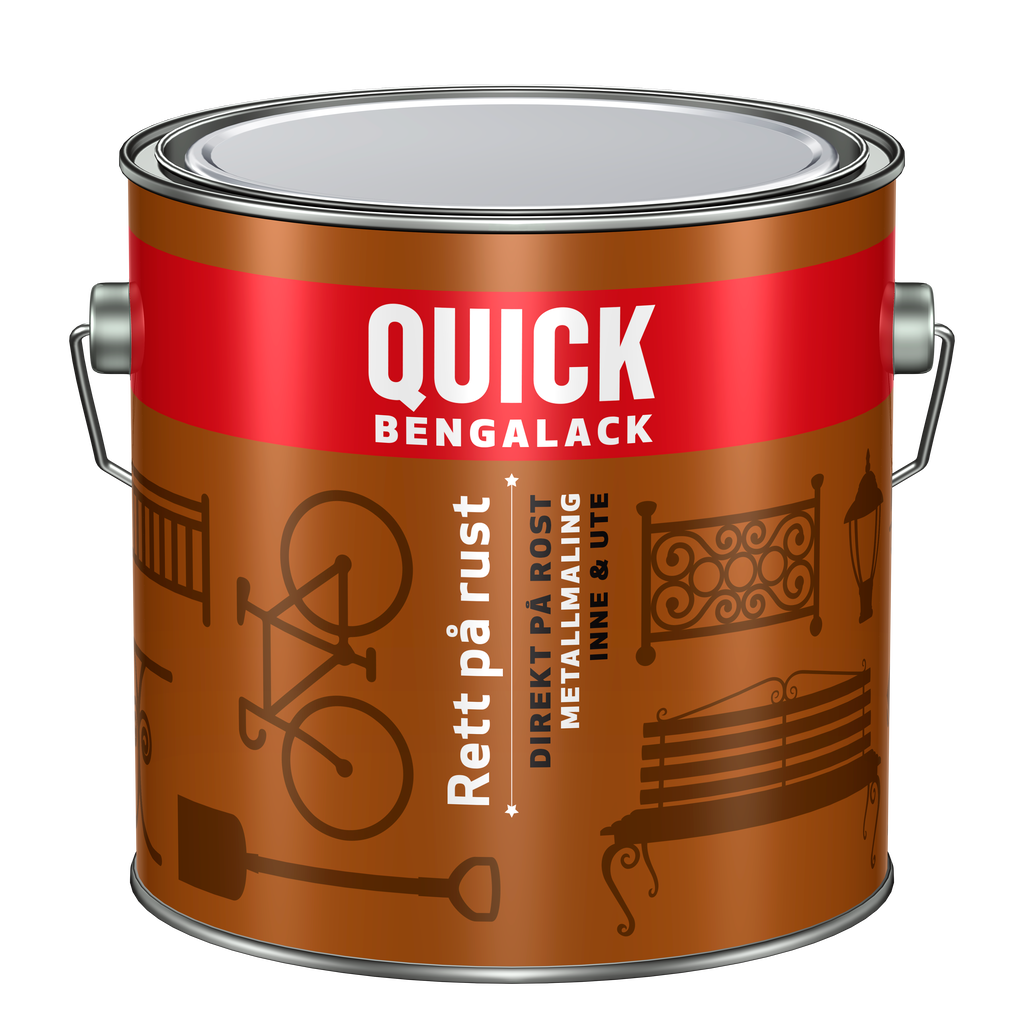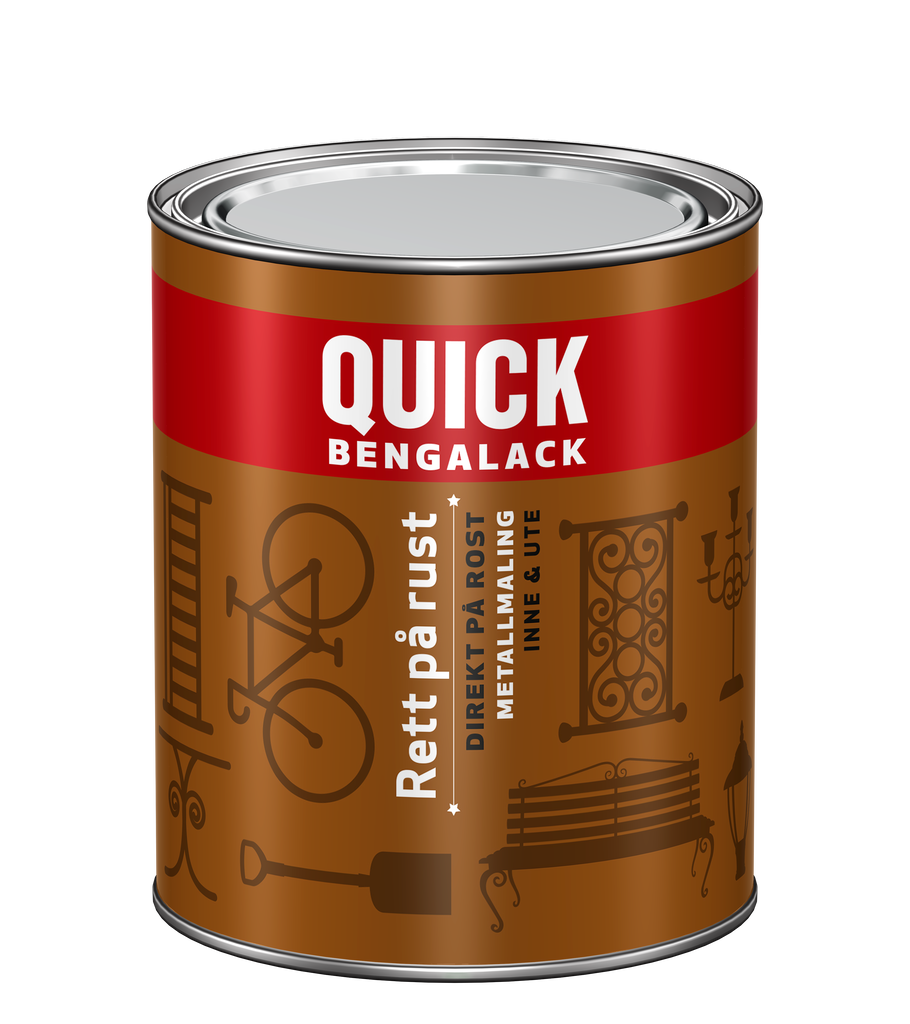 Quick Bengalack Direkt på Rost är en högkvalitativ metallfärg som kombinerar tre funktioner i en och samma burk: den fungerar som rostskyddsprimer, grundfärg och täckfärg samtidigt.