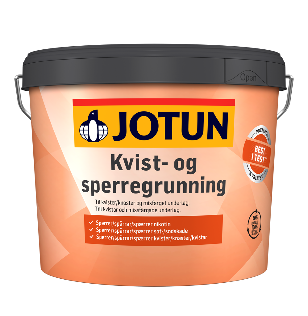 Jotun Kvist & Spärrgrund är en vattenburen grundfärg som effektivt spärrar kvistar, sot, nikotin och andra vatten- och oljelösliga färgämnen. Den ger en god vidhäftning för slutstrykningsfärgen och förhindrar missfärgningar på ytan.